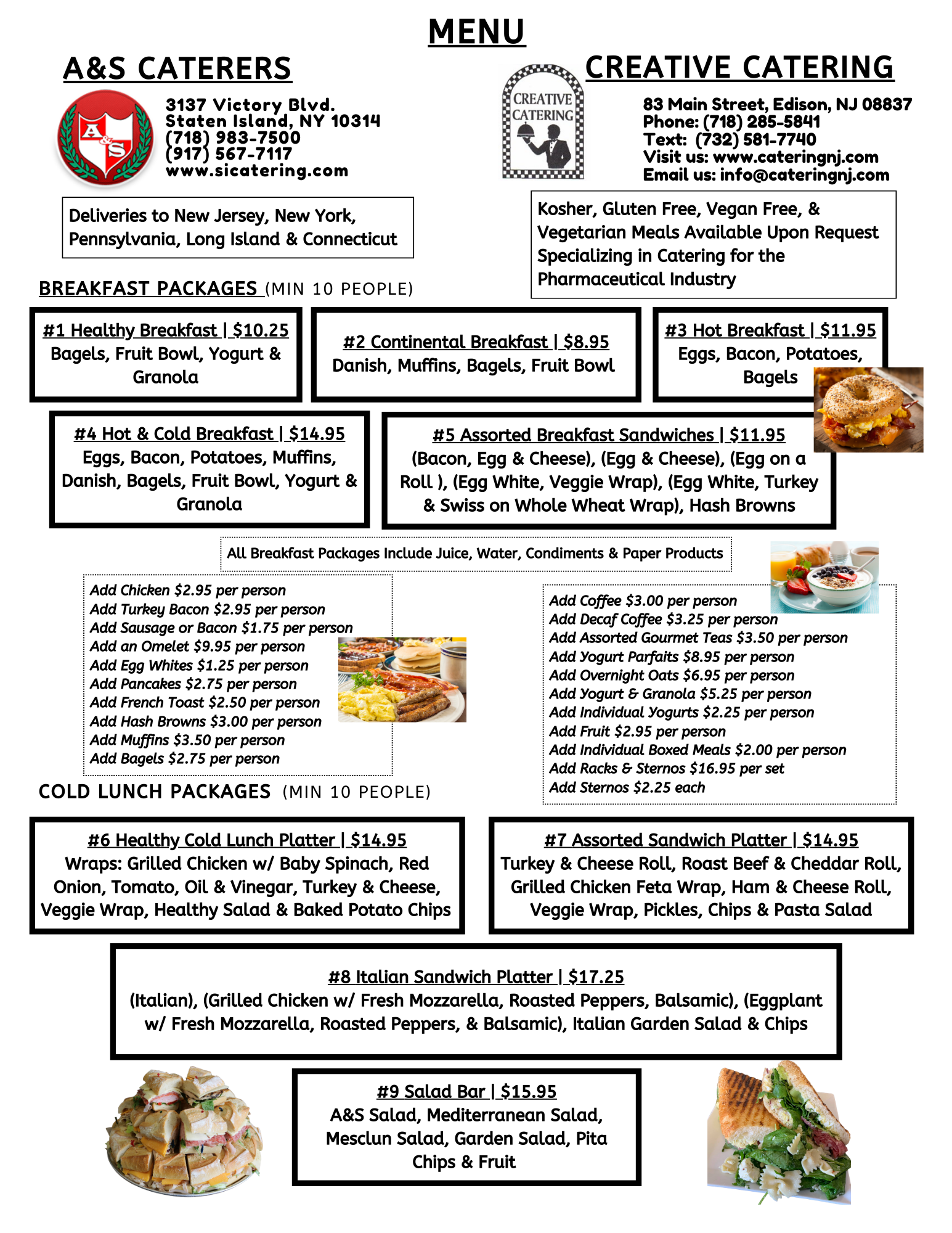 Our exclusive menu for pharmaceutical representatives is convenient for those day to day lunches and sales meetings. Planning a last minute office meeting or product seminar is made easy for you to place an food order. We have a direct catering line set-up for pharmaceutical reps that is available 24 hours-7days a week. Just let us know the delivery day, time, address, number of people and any dietary restrictions and we will handle everything from there. We can develop a no-hassle custom menu or you can order from one of our menu packages below. A&S will deliver and set-up you order and ensure on-time delivery. Place your order with us today by calling tor texting to (917) 567-7117 and Taste the Difference!